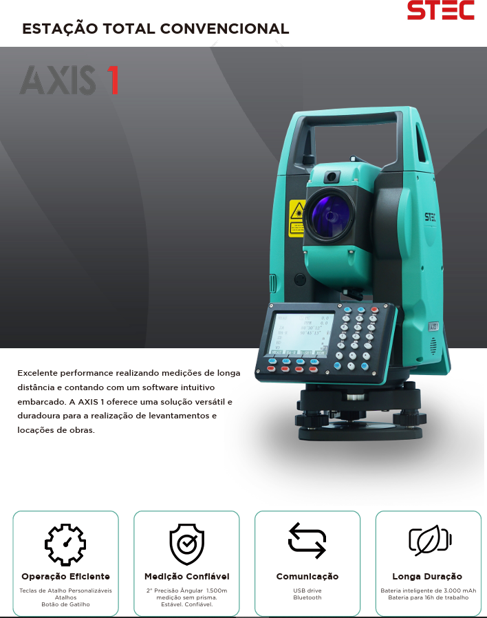 A AXIS 1 é uma estação total manual com alto desempenho, projetada para operações topográficas de precisão. Ela oferece uma tela de alta resolução, interface amigável, programas internos de topografia e bateria com mais de 16 horas de duração — ideal para trabalho contínuo de campo.