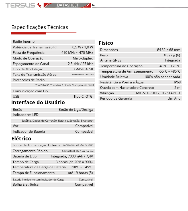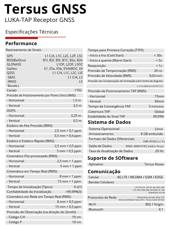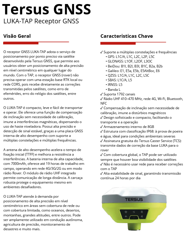 O LUKA-TAP é um receptor GNSS multiconstelação compacto, robusto e de alta precisão, que incorpora o serviço TAP (Tersus Advanced Positioning) de correção via satélite. Com até 1792 canais, compensação de inclinação imune a interferência magnética, bateria de 7000 mAh para até 19 horas de operação, rádio UHF interno, 4G, Wi-Fi, Bluetooth e NFC, é ideal para aplicações avançadas mesmo em locais remotos — sem depender de estação base, rede RTK ou CORS.