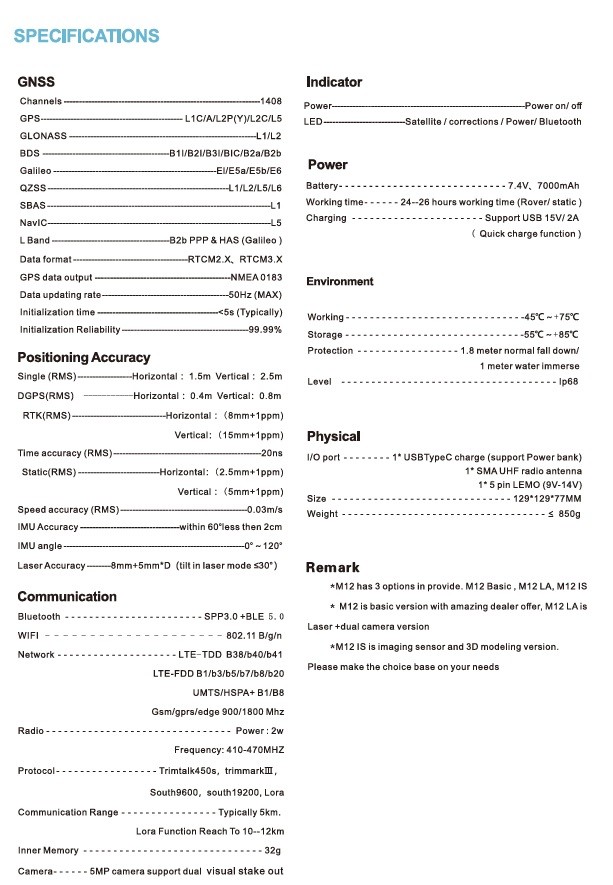 - Precisão pós-processada horizontal de 2.5mm + 0.1ppm / V 3.5mm + 0.4ppm RMS.
