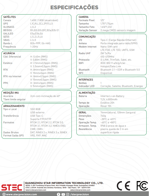 Traz ainda rádio UHF interno para comunicação estável e suporte ao SPOS (PPP) para correções via satélite, garantindo cobertura e confiabilidade.