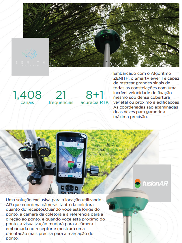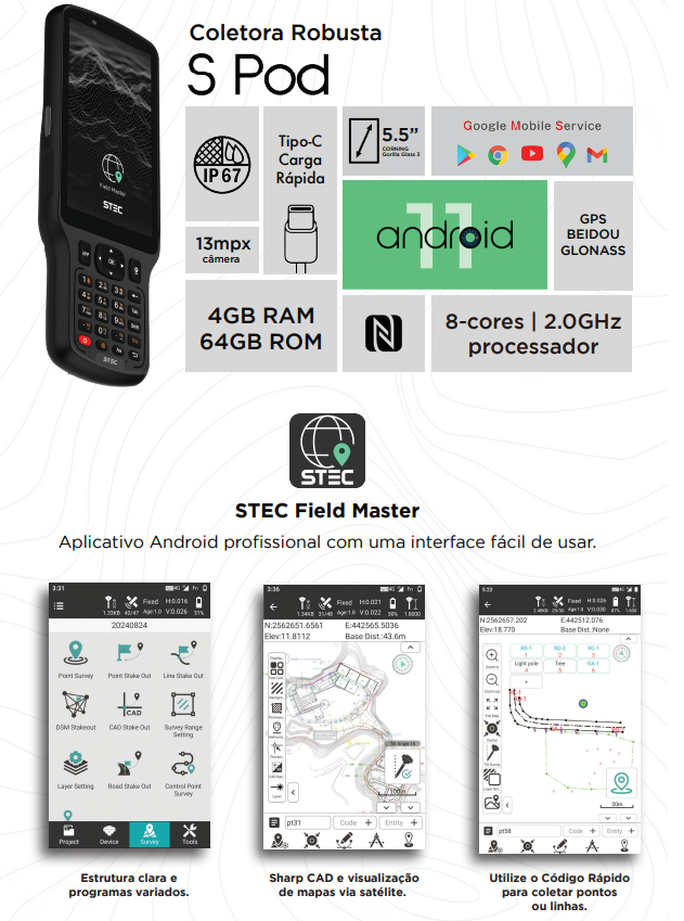O STEC SV1 é um receptor GNSS compacto e robusto que acelera a locação em campo com câmera integrada e Realidade Aumentada — o operador vê o ponto no ambiente real, tornando o processo mais rápido, intuitivo e confiável.