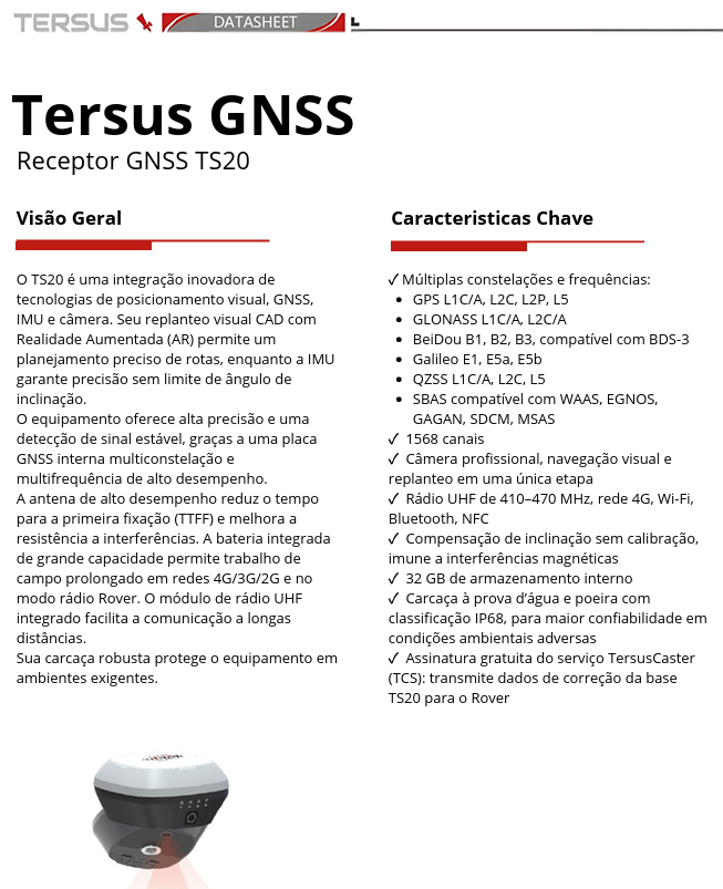 O TS20 é uma antena inteligente GNSS concebida para stakeout visual com AR — integrando GNSS multi-constelação, IMU e câmera profissional de 2 MP. Projetado para operar com o app NUWA, exibe seta direcional e distância em tempo real sobre vídeo Full HD a 30 fps, aumentando a eficiência em até 50 % em levantamentos.