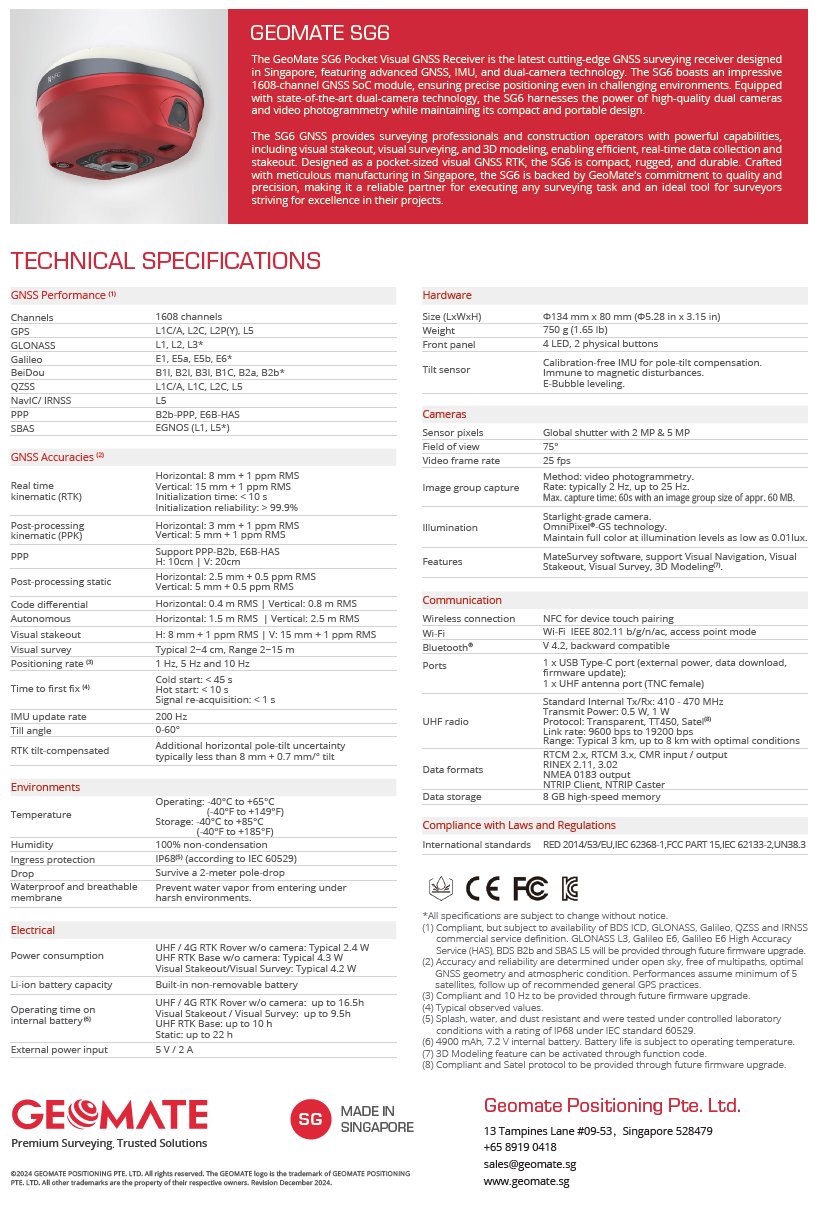 Projetado como um GNSS RTK de bolso, o SG6 é compacto, robusto e durável. Fabricado com meticulosa fabricação em Singapura, o SG6 conta com o compromisso da GeoMate com a qualidade e a precisão, tornando-o um parceiro confiável para a execução de qualquer tarefa de topografia e uma ferramenta ideal para topógrafos que buscam a excelência em seus projetos.