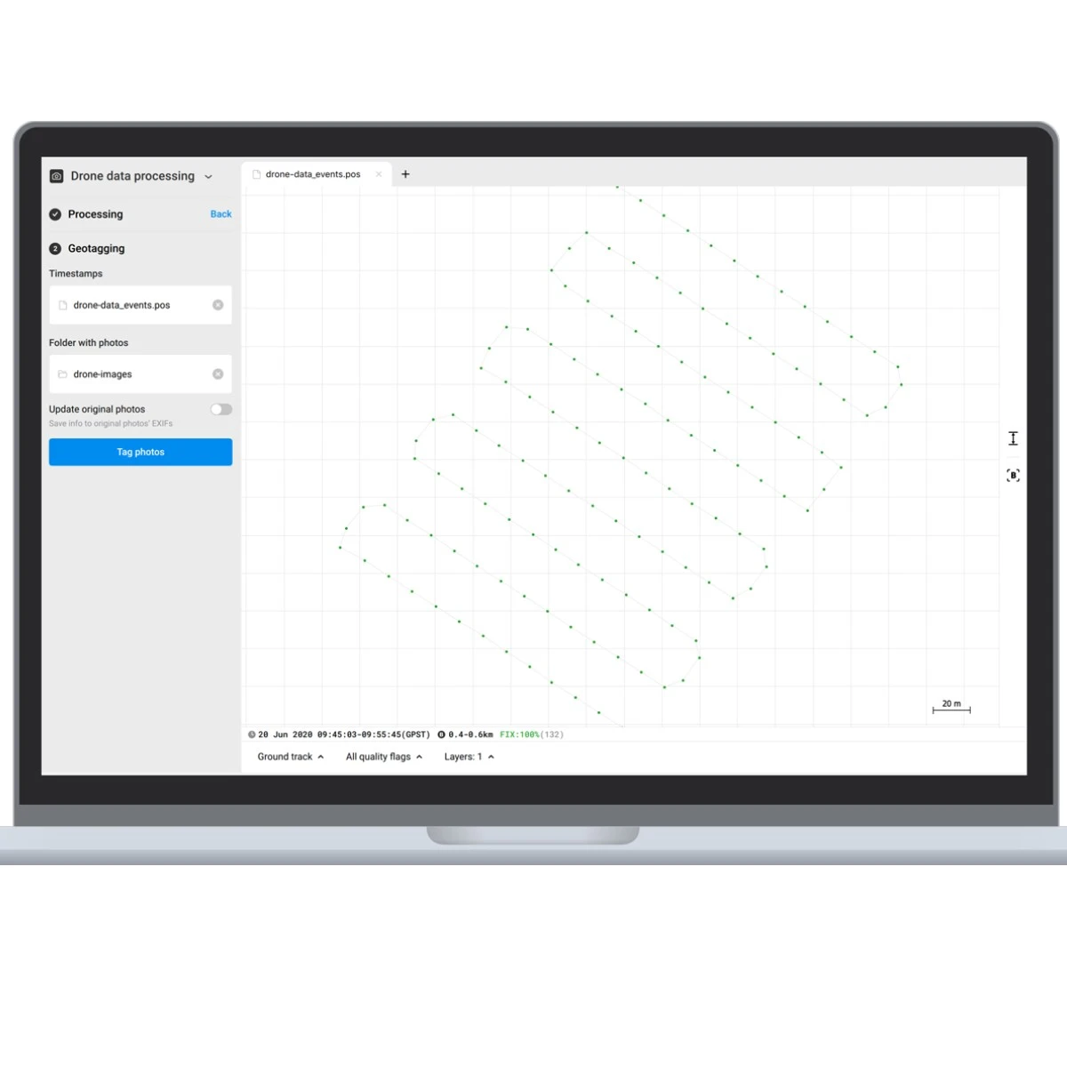 Registre dados brutos no formato RINEX para pós-processamento. Você pode usar o software PPK gratuito, Emlid Studio ou qualquer outro software compatível com RINEX. Os registros também são compatíveis com os serviços OPUS, AUSPOS e PPP, para que você possa obter resultados altamente precisos. em qualquer lugar do mundo.